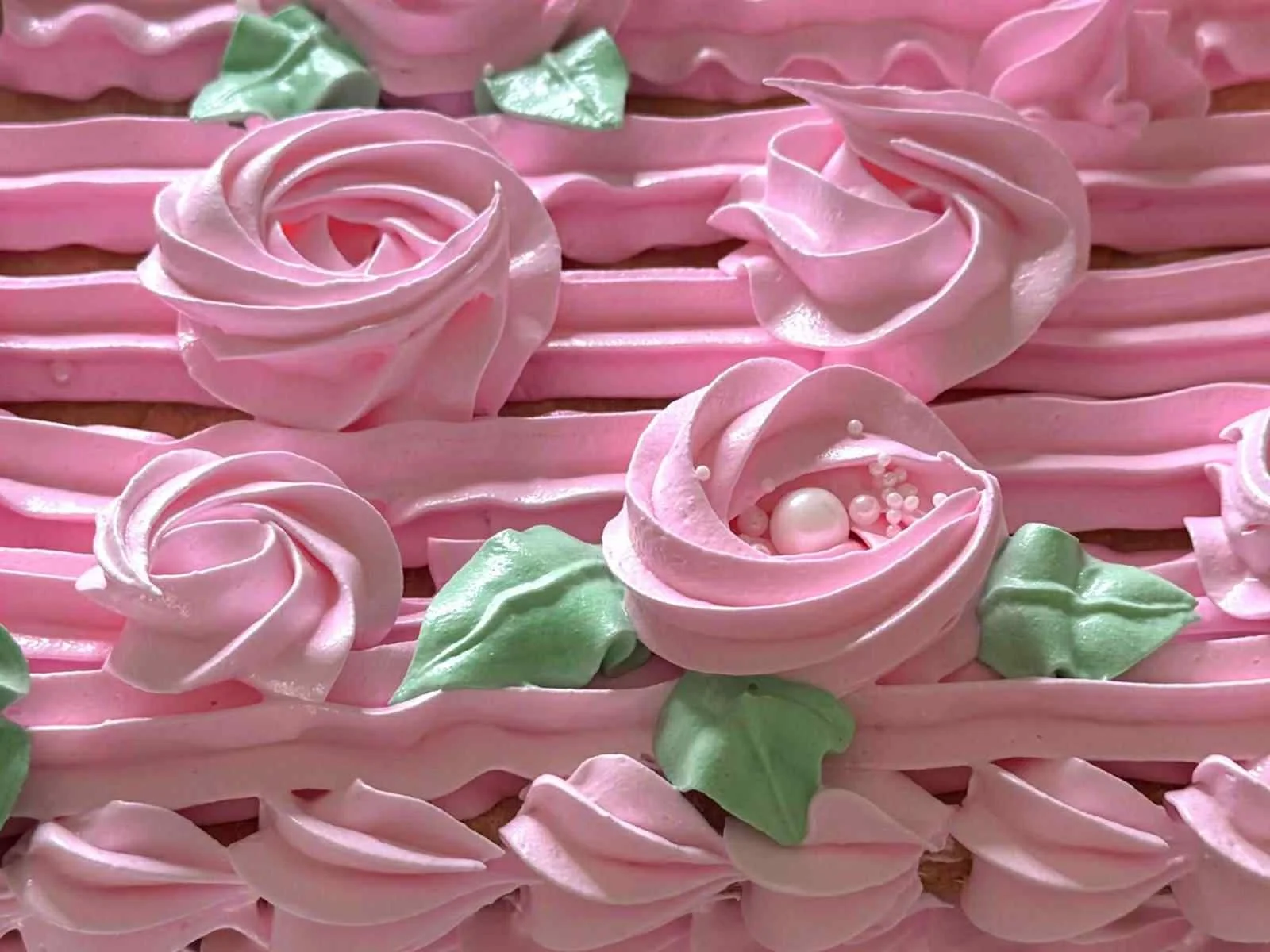 Topped with pink meringue-style frosting and delicate white pearl accents.